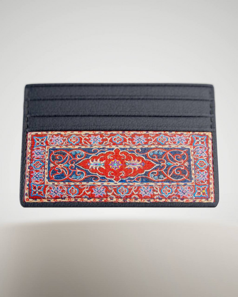 Rugs drawn on one side with high precision and limited pieces on a leather cardholder/wallet. Holds 6 cards and room to store money.